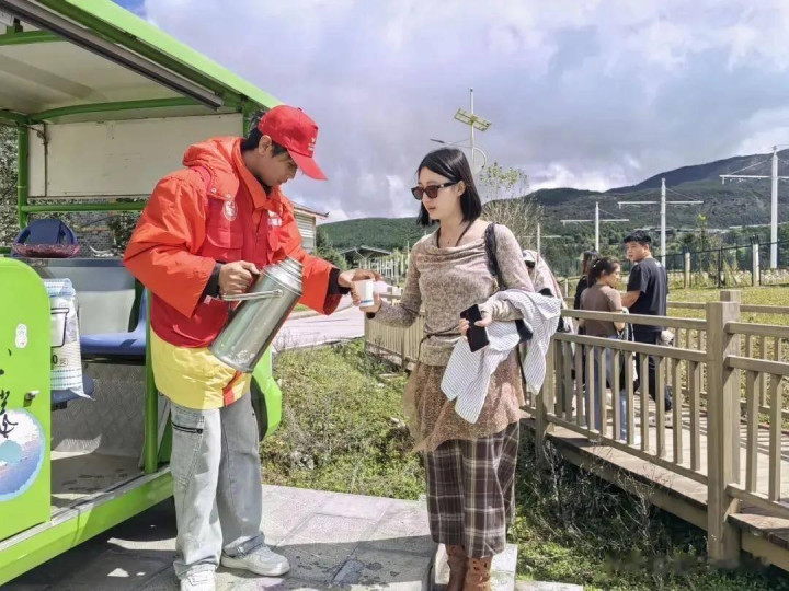 在核心游览区的“玉龙雪山学雷锋志愿服务点”,头戴红帽、身着红马甲的志愿者正忙碌着,“您好,需要热水吗?请慢用”的温馨话语不断响起。橙黄色岗亭外,“雷锋精神 拾金不昧”的横幅格外醒目,这里不仅是提供问询指引、休憩饮水的便民站,更是传承爱心的文明窗口。志愿者们用微笑化解游客的疲惫,用耐心解答旅途的疑问,将“奉献、友爱、互助、进步”的志愿精神悄然播撒在雪山脚下。
